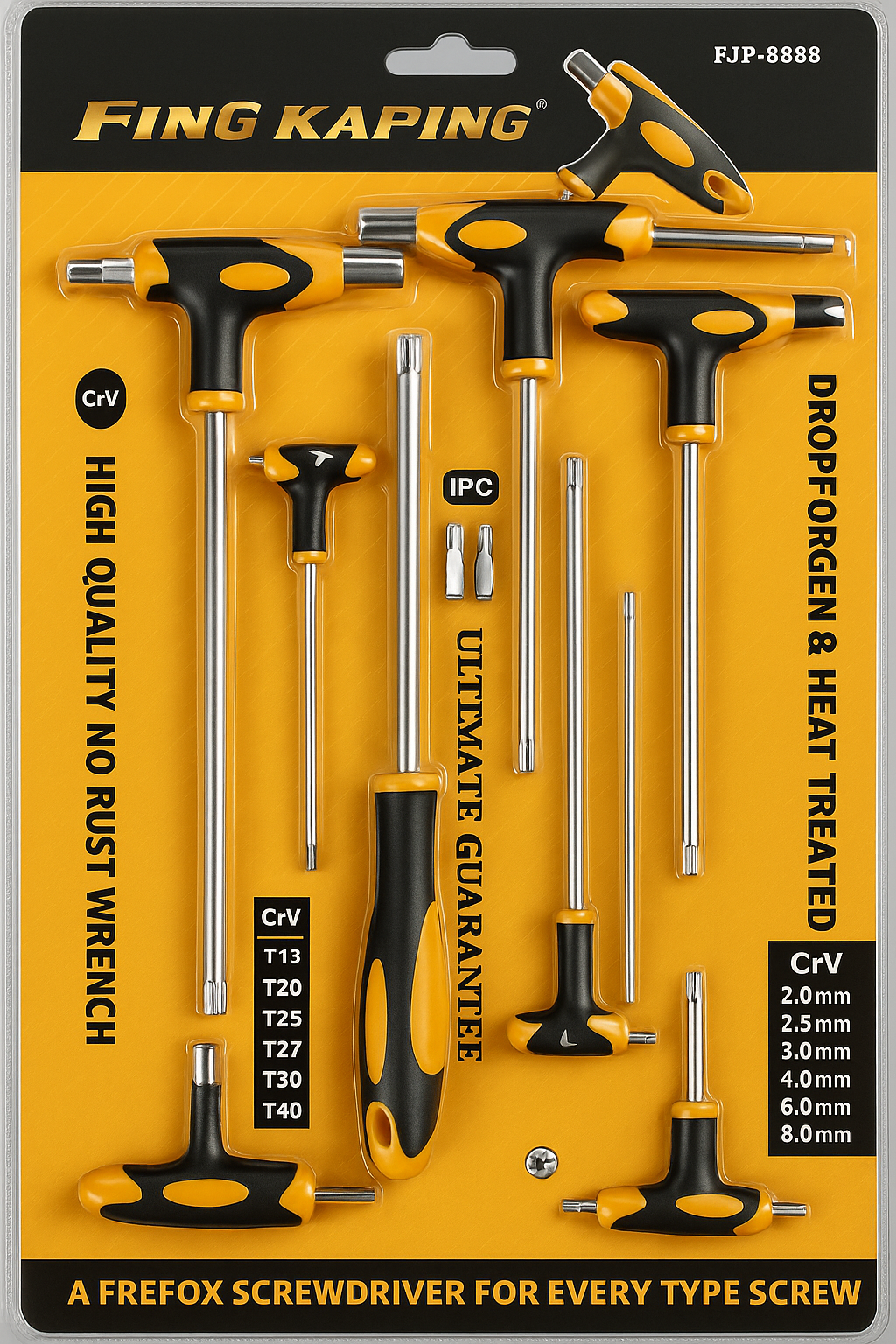 Profesionalni set T-ključeva FING KAPING FJP-8888 izrađen od visokokvalitetnog hrom-vanadijum (Cr-V) čelika, otporan na rđu i mehanička oštećenja. Idealan je za servisere, mehaničare i majstore koji traže pouzdan alat za svakodnevni rad.
